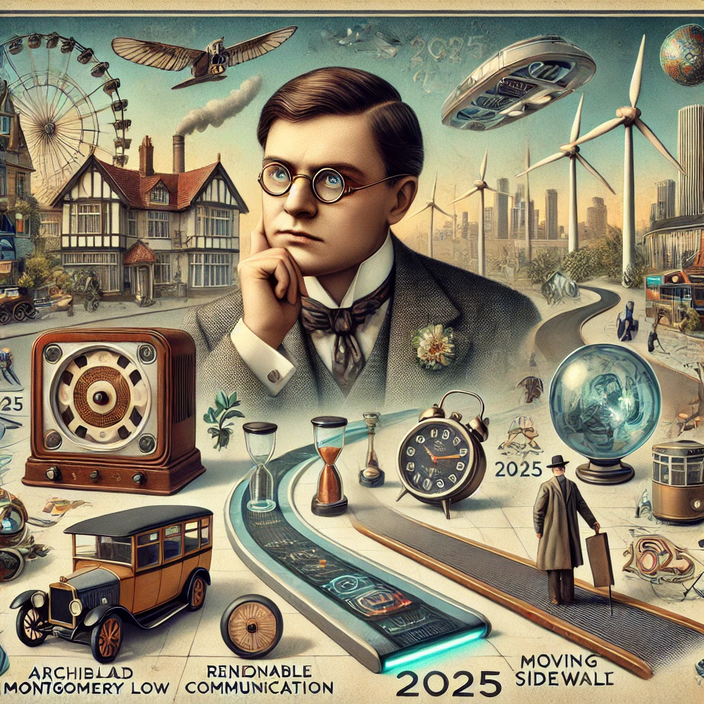 아치볼드 몽고메리 로우는 1925년에 발표한 2025년에 대한 예측을 통해 당시로서는 상상하기 어려운 여러 기술적 발전을 제시했습니다. 그의 예측에는 특정 시간에 사람을 깨우기 위한 라디오 알람 시계, 오늘날의 스마트폰과 비슷한 개인 통신 기기, 뉴스와 엔터테인먼트를 위한 확성기와 텔레비전의 보급 등이 포함되었습니다. 또한, 그는 에너지 생산을 위해 풍력 및 조력 발전의 활용을 제안했으며, 이동성을 높이기 위해 무빙워크와 에스컬레이터의 구현을 예상했습니다. 이러한 예측은 그가 당시의 기술 발전 상황을 면밀히 관찰하고 이를 바탕으로 미래를 상상하는 뛰어난 능력을 지녔음을 보여줍니다.